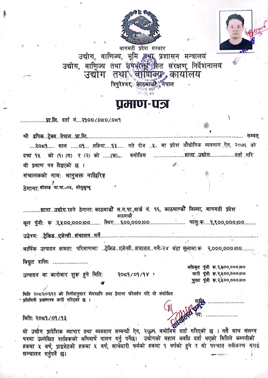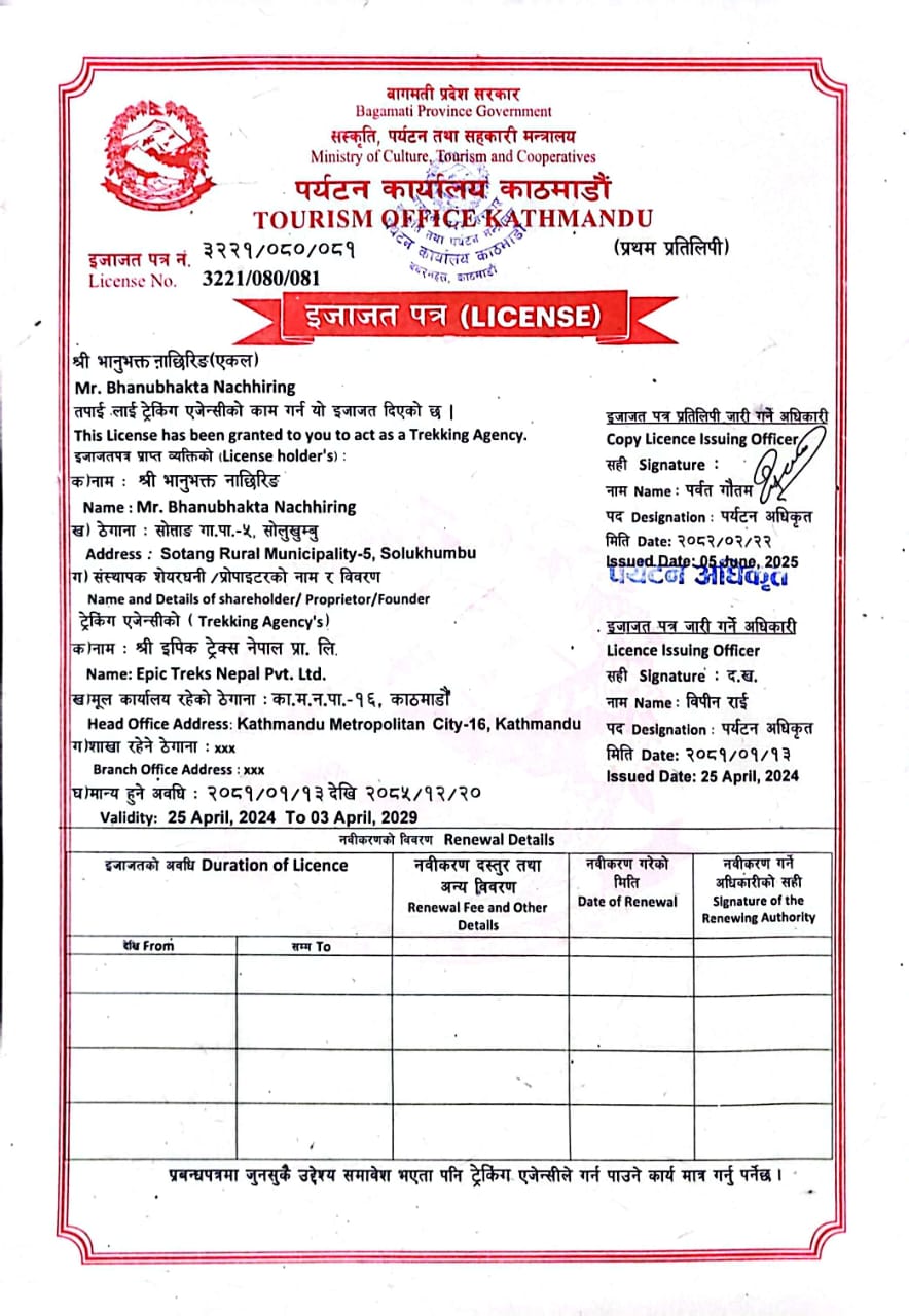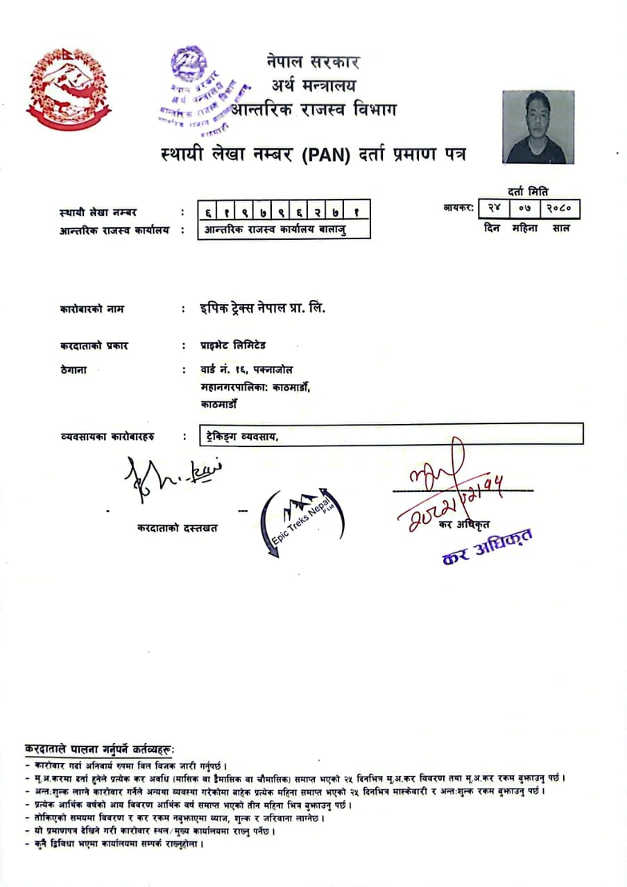 Epic Trek Nepal Pvt. Ltd is legally registered and accredited by the Government of Nepal under the Company Act 2063 (2006) in Nepal and it is licensed by the Department of Tourism- (Ministry of Tourism, Government of Nepal).