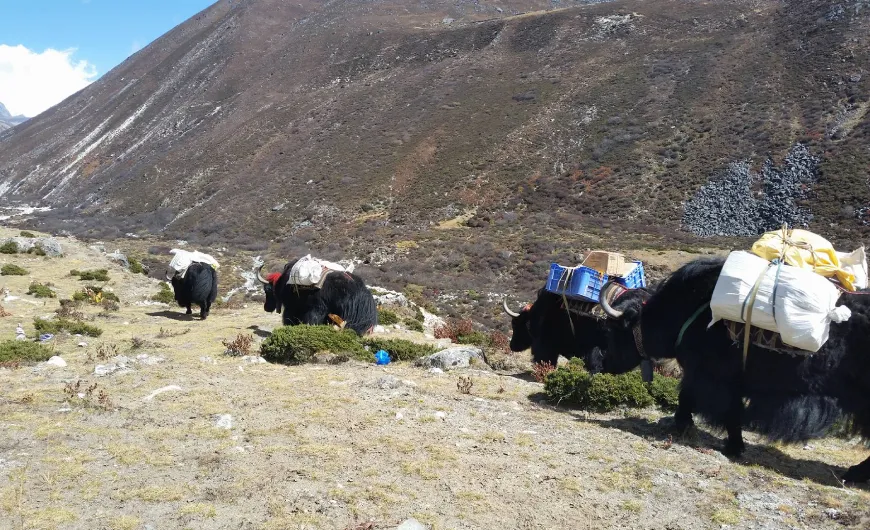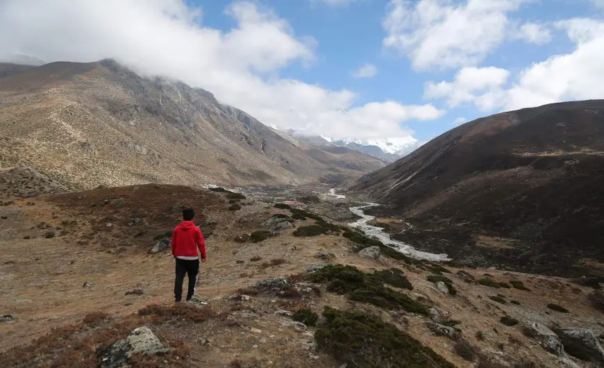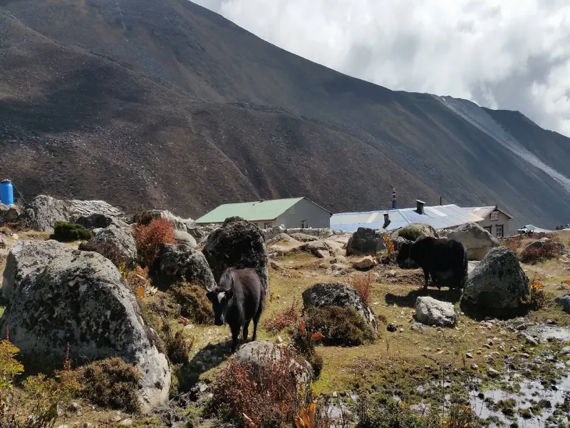 Gå til Lobuche gjennom steinete stier og gamle isbreer. Du vil se fjellminnesmerker underveis og føle den tynne luften bli kaldere. Utsikten er fantastisk, men landskapet blir røffere. Overnatt på Lobuche for et varmt måltid og en natt å tilbringe.