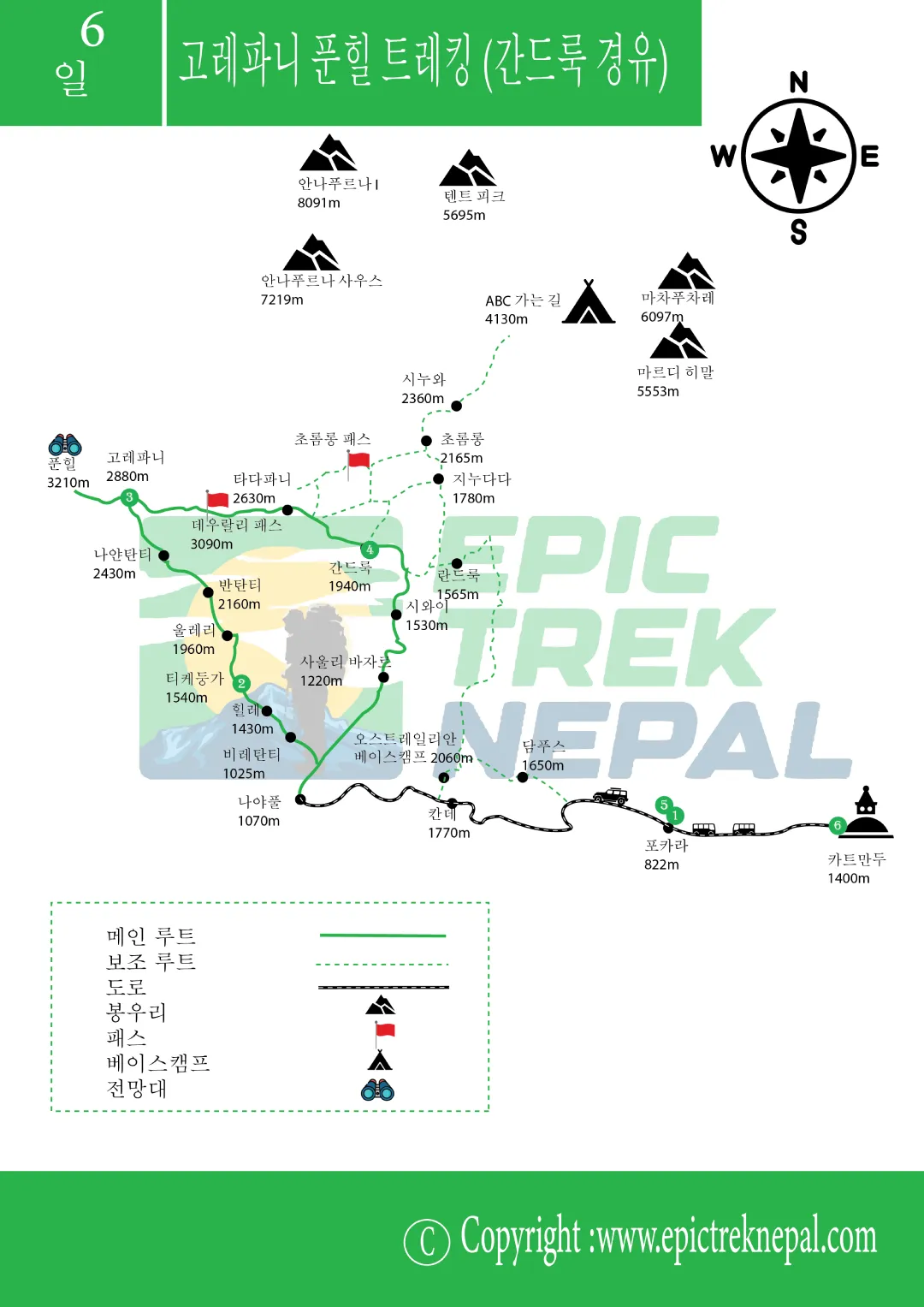 Itinerary of 고레파니 푼 힐 간드룩 루트. 감동 일출 8일 트레킹
