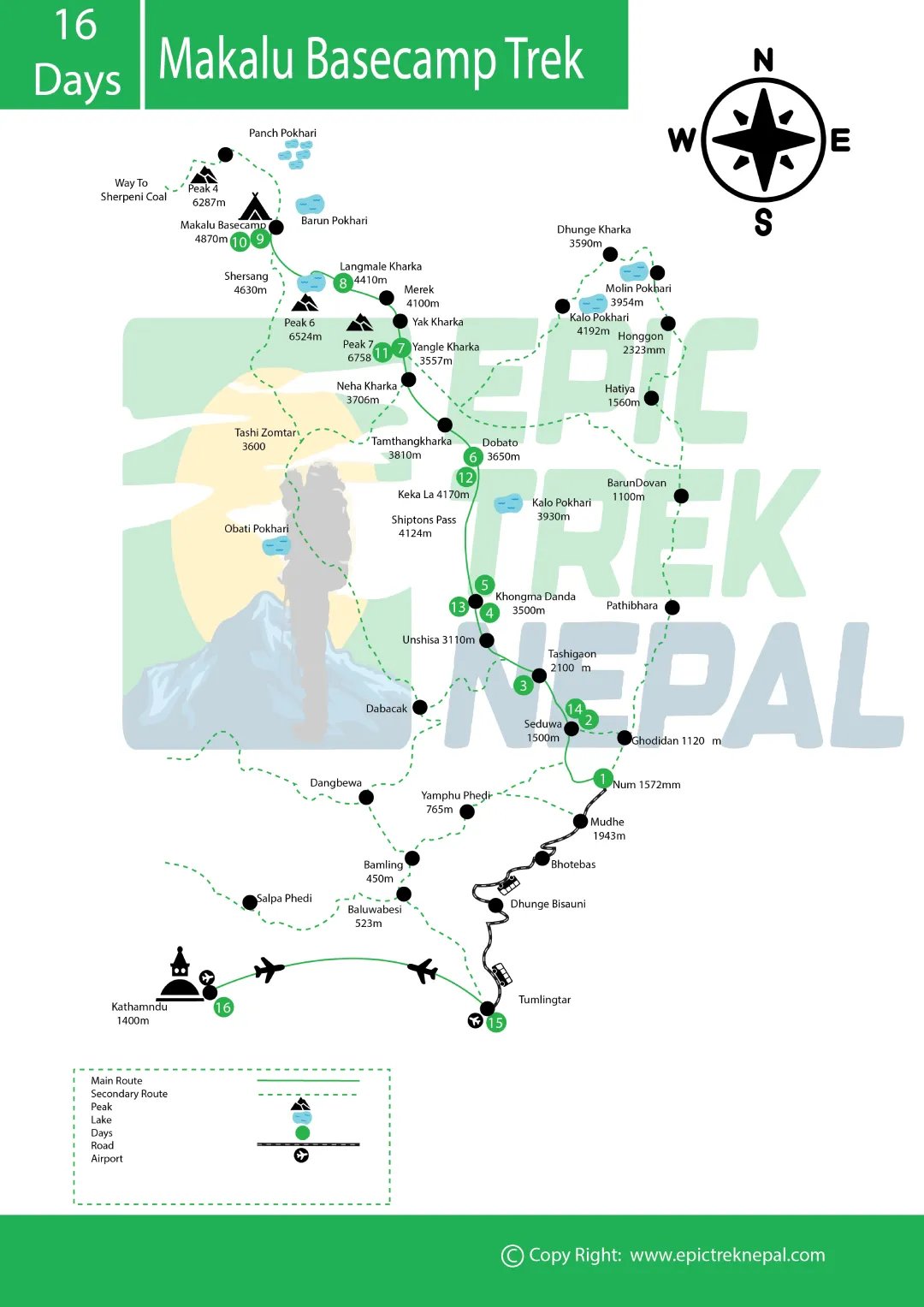 Our itinerary covers 18 days, starting from Tumlingtar and passing through diverse landscapes before reaching the base camp at 4,870 meters.