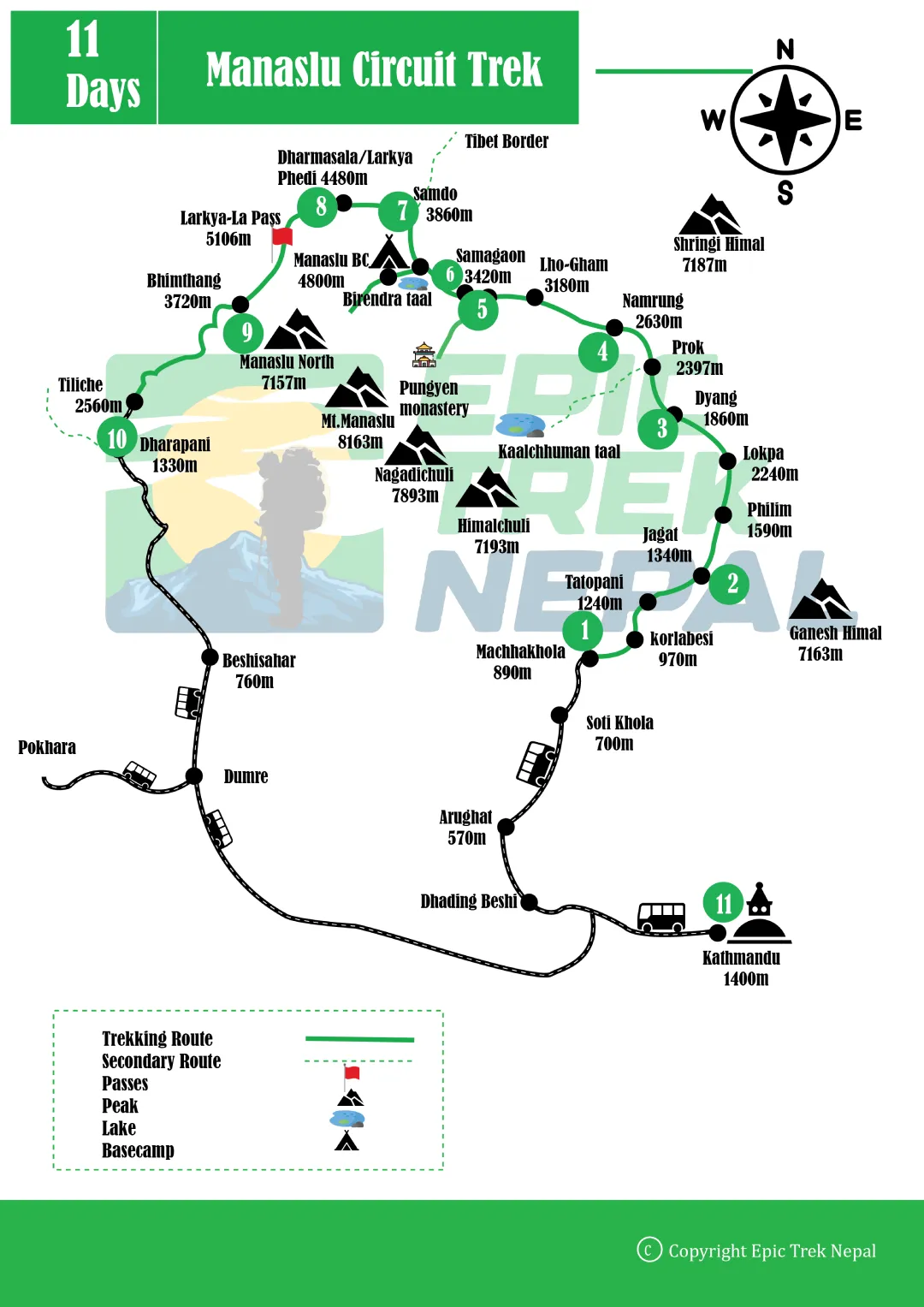 Larkya La Pass is the highest point at 5,106m.